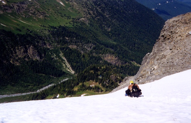 Glissading down the lower Frying Pan Glacier, Summer Land below